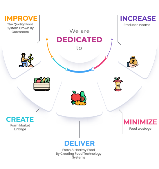 We wish to empower producer groups by increasing their incomes by creating an efficient linkages and additional income streams by providing support in terms of food technology, improve efficiency in the food system by adopting smart logistic systems and provide food traceability and transparency to the end consumer thereby ensuring the food grown is healthy and provide right nutritional value.